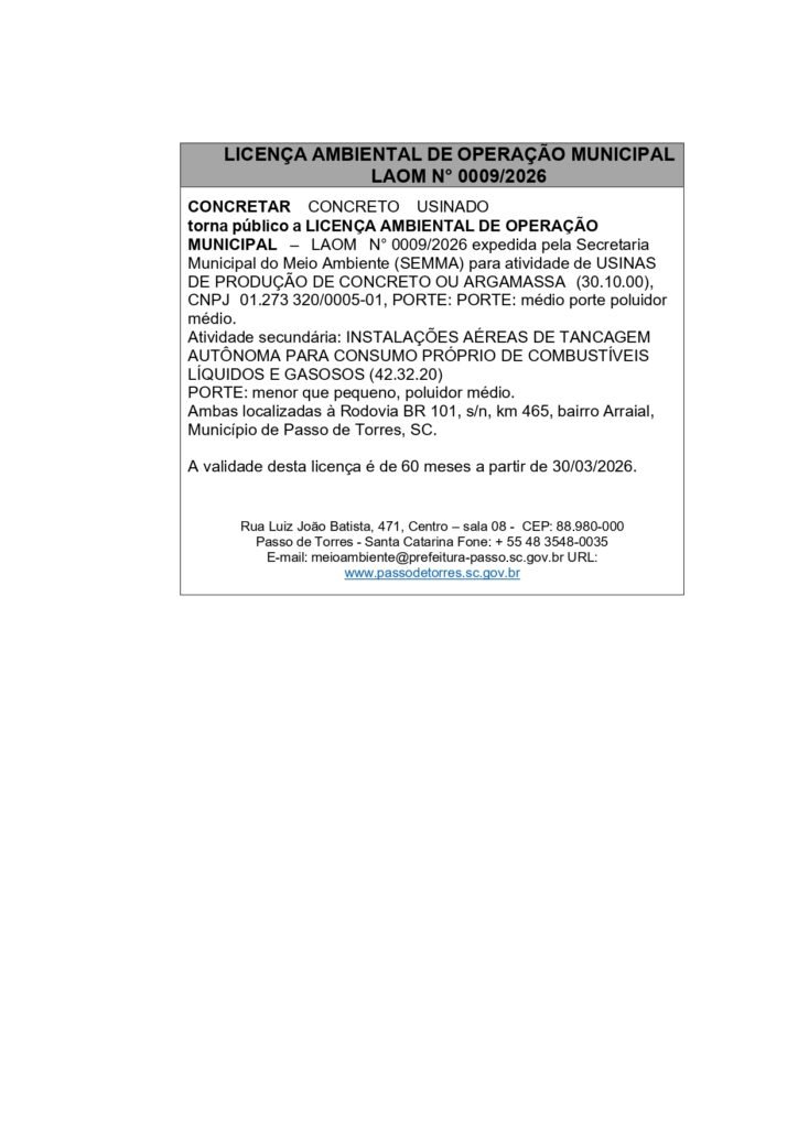 torna público a LICENÇA AMBIENTAL DE OPERAÇÃO MUNICIPAL – LAOM N°0009/2026 expedida pela Secretaria Municipal do Meio Ambiente (SEMMA) para atividade primária de USINAS DE PRODUÇÃO DE CONCRETO OU ARGAMASSA (30.10.00), CNPJ 01.273.320/0005-01