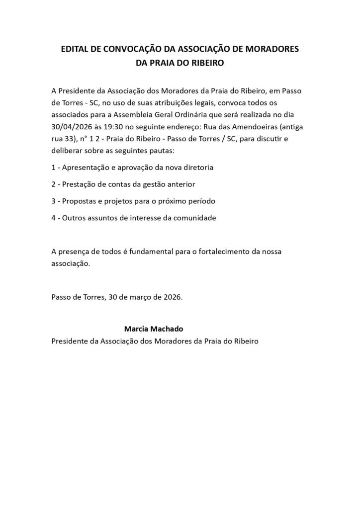 A Presidente da Associação dos Moradores da Praia do Ribeiro, em Passo de Torres – SC, no uso de suas atribuições legais, convoca todos os associados para a Assembleia Geral Ordinária que será realizada no dia 30/04/2026 às 19:30 no seguinte endereço: Rua das Amendoeiras (antiga rua 33), n° 1 2 – Praia do Ribeiro – Passo de Torres / SC, para discutir e deliberar sobre as seguintes pautas: