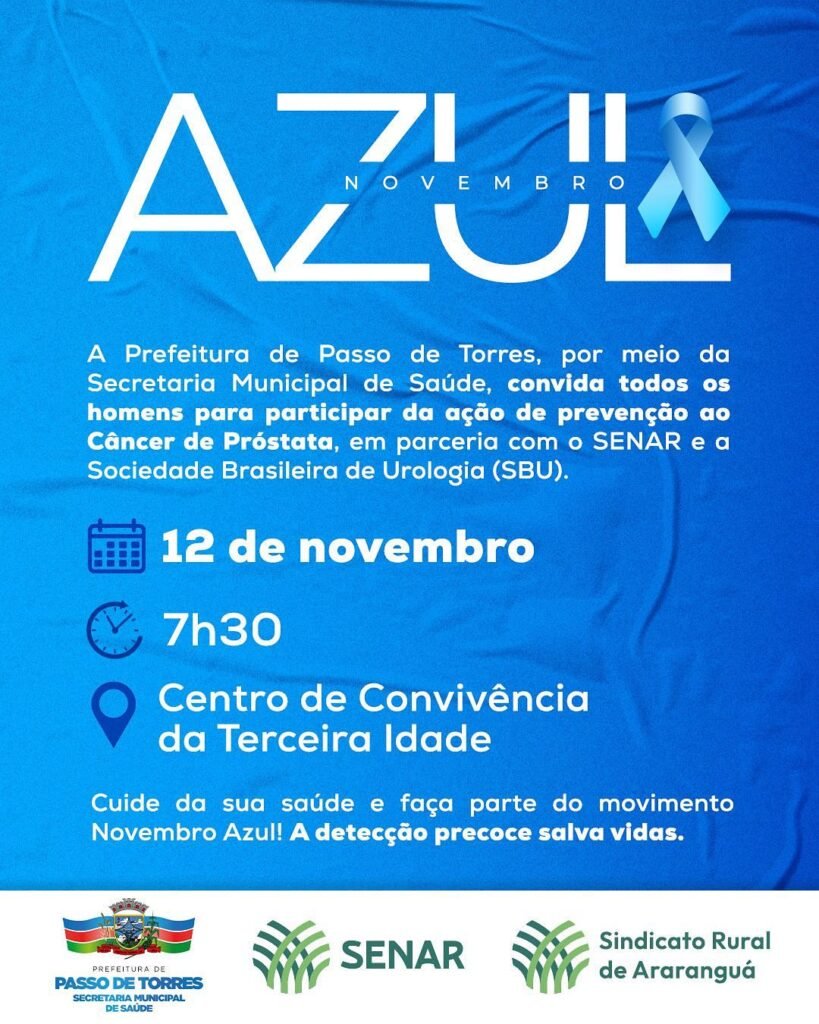 A Prefeitura de Passo de Torres, por meio da Secretaria Municipal de Saúde, vai realizar uma ação de prevenção ao Câncer de Próstata, em parceria com o Serviço Nacional de Aprendizagem Rural (SENAR) e o Sindicato Rural de Araranguá.